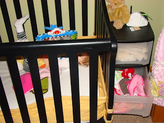 Lately, her favorite thing is to pull bibs out the plastic drawers next to her crib. On this particular day, I counted 8 bibs in her crib.